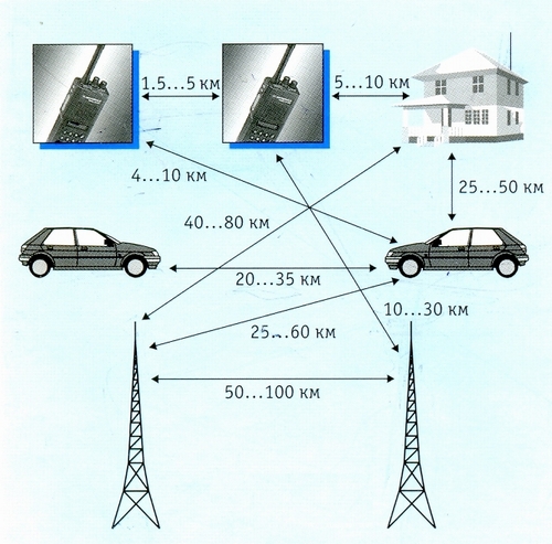 Портативные радиостанции позволяют устанавливать соединения друг с другом на расстоянии 1 -5 км. в зависимости от рельефа местности или от наличия заграждающих конструкций, например металлических или железобетонных.